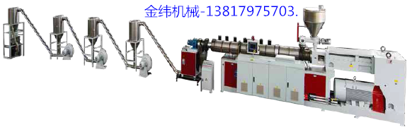 該機(jī)組是由系列錐形雙螺桿擠出機(jī)與相應(yīng)造粒輔機(jī)組成的成套設(shè)備,主要適用與PVC、PE類粉料添加木粉或填充料的造粒。生產(chǎn)的塑料顆 粒均勻、密實(shí)、美觀,輔機(jī)采用模面切粒,風(fēng)送集料,振動(dòng)分離冷卻,具有自動(dòng)化程度高,生產(chǎn)效率佳等特點(diǎn)。